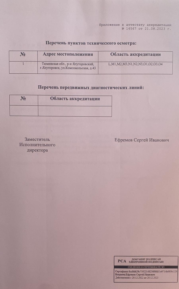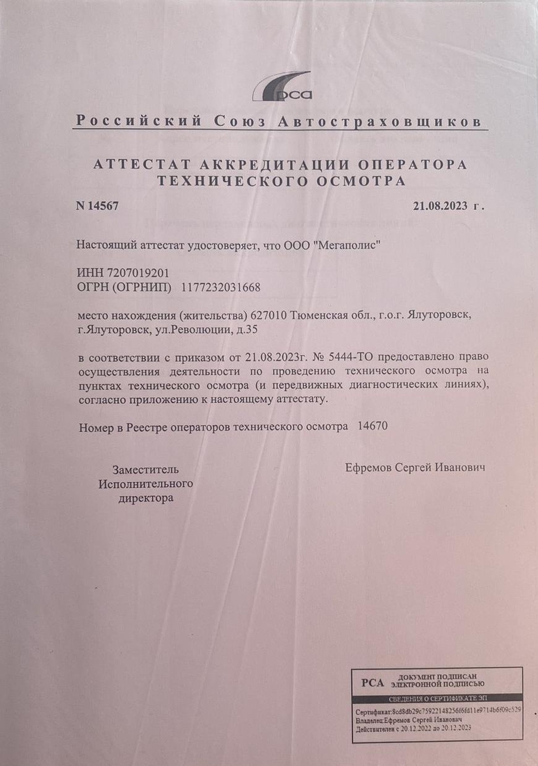 ООО «Мегаполис» внесено в реестр операторов технического осмотра за №14670. По номеру оператора, указанному в аттестате, можно проверить аккредитацию на сайте РСА.